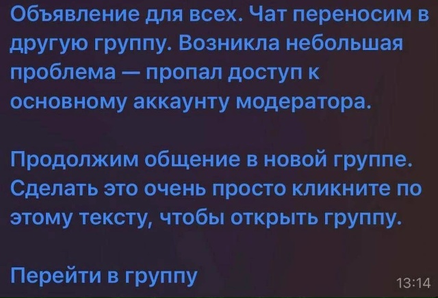 Вам может прийти сообщение или появиться объявление о том, что «наш чат переезжает» или «группа переносится в новый канал». К тексту прилагается ссылка для перехода.